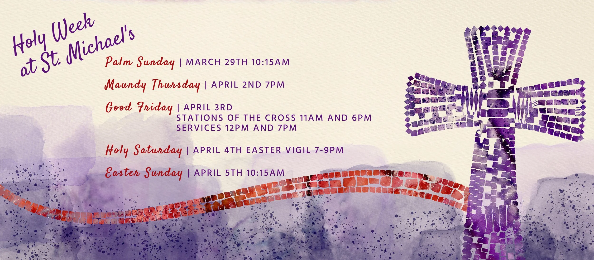 Lent is a time when Christians throughout the world engage in penitence and self-sacrifice in preparation for Easter. It is 40 days long and covers 6 Sundays— beginning on Ash Wednesday and culminating on Easter in the joyous celebration of the bodily Resurrection of Jesus Christ from the dead! We hope you will join us at St. Michael’s for one of the most central seasons of the Church year.